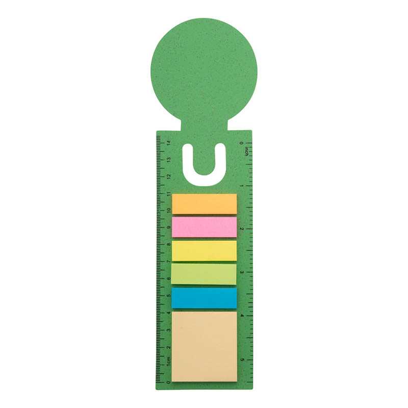 Ekologická plastová záložka a pravítko z pšeničnej slamy s 25 lepiacimi papierikmi a 125 popisovačmi stránok (v 5 rôznych farbách).