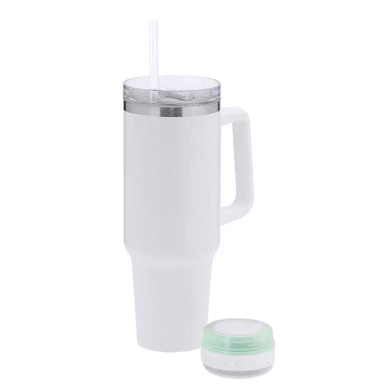 NOVINKA 2025. Thermal mug with integrated Bluetooth® 5.3 speaker of 3W. With a capacity of 1.25L, ergonomic handle, and made of double-walled stainless steel, ensuring maximum durability and excellent temperature maintenance for both cold and hot beverages. It is ideal to have on your desk, table, or any surface where you can comfortably enjoy your favorite drink. The lid features a snap closure and an easy-open dispenser, BPA-free, ensuring safety and ease of use. It features a matching non-slip base for greater stability.The Bluetooth speaker integrated into the base of the mug is easily removable thanks to its screw system and includes intelligent RGB LED lighting that syncs to the rhythm of the music, creating a unique visual and auditory experience. Additionally, the hands-free function allows you to take calls without having to stop what you're doing.