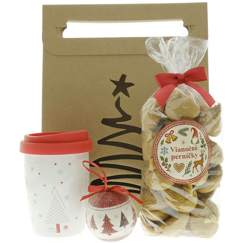 Vianočná ozdoba, Keramický cestovný hrnček 260 ml, Vianočné perníky 250g. Darčeková taška 30x23x10 cm