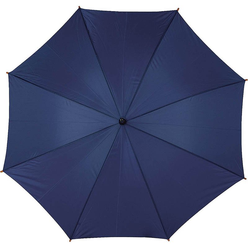 Polyester (190T) automatic umbrella with eight panels. Metal frame and wooden shaft and handle.