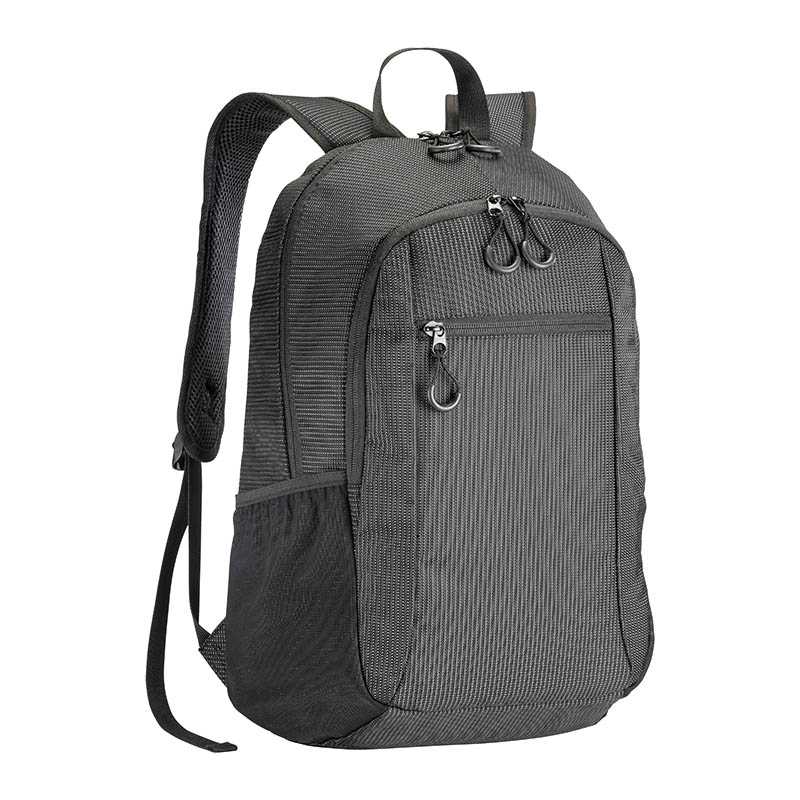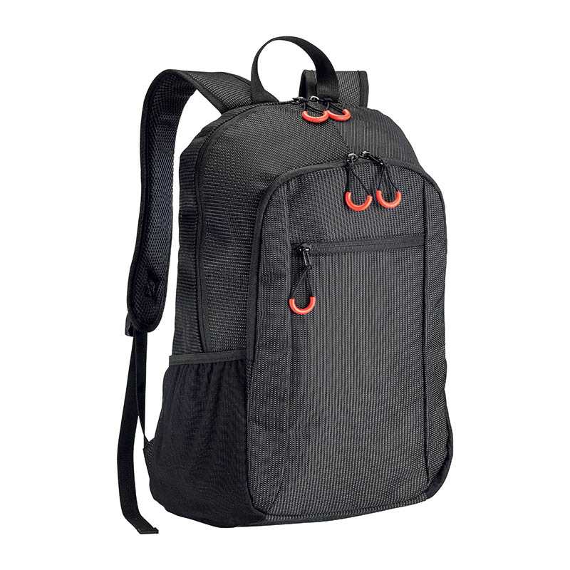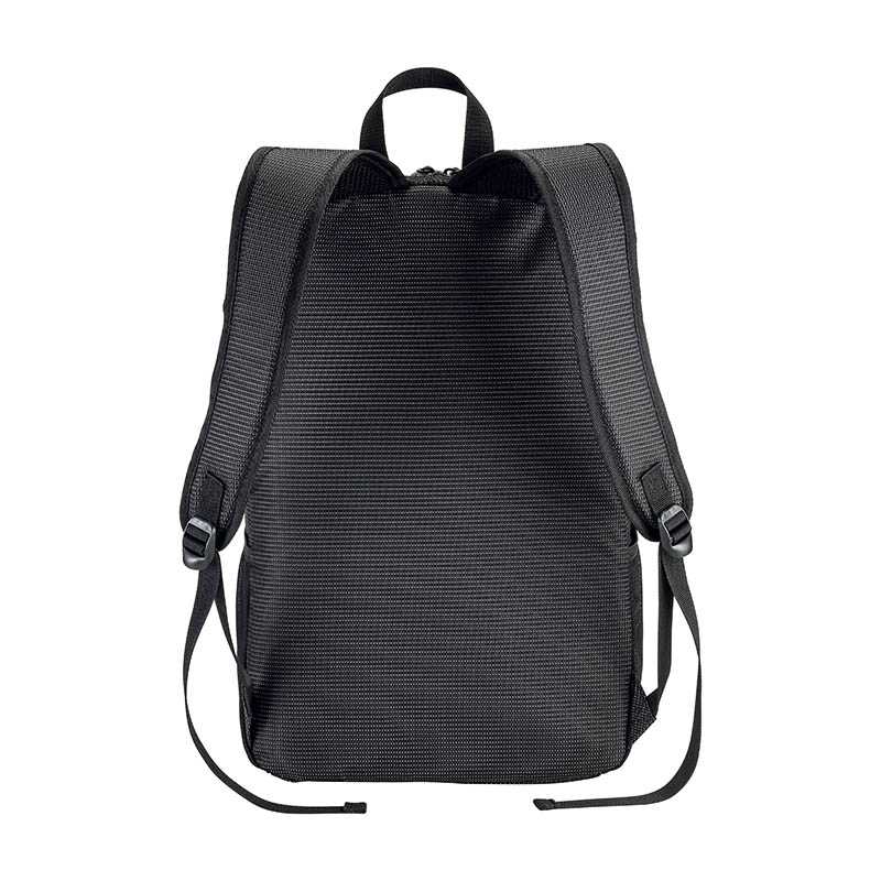 Water resistant polyester laptop backpack (15). Padded notebook compartment and inside pocket. Padded back and shoulder straps with breathable materia