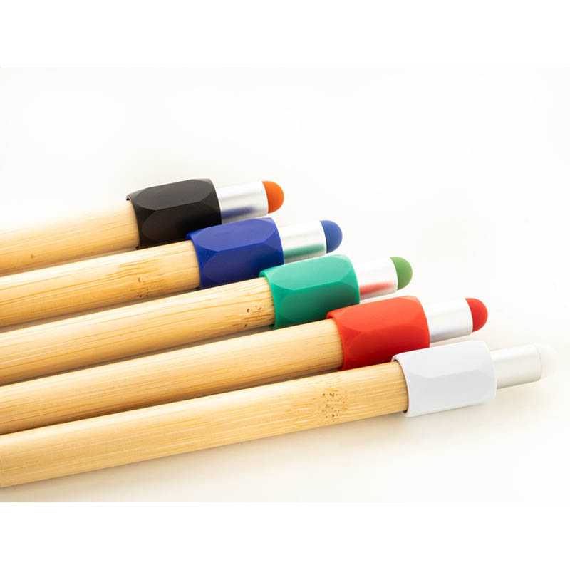 NOVINKA 2025. Bambusové guľôčkové a dotykové pero s fidget spinnerom z recyklovaného ABS plastu. S modrou náplňou.