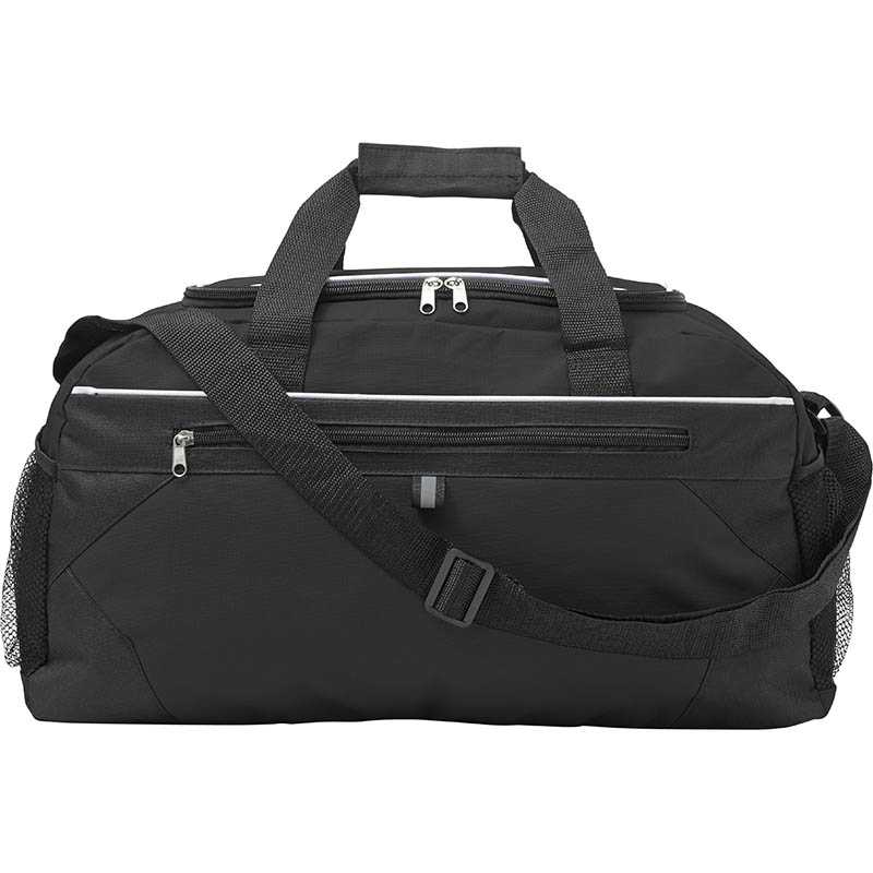 Polyester (600D) sports bag with front zipped pocket and a mesh pocket on both sides. Adjustable shoulder strap.