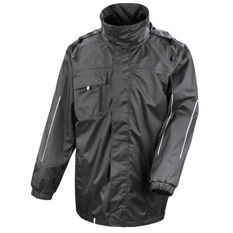 Outer Jacket: Taped seams Inside pockets Chest zip pocket 1 elasticised cuff Full front 2-way zip Front side pockets Reflective detailing Tear release storm flap Concealed drawcord hood Secondary inner zip to attach inner jacket Inner Jacket: Front zipped pockets Elasticised bound cuff RESULT budget friendly range: price point target Ready to brand- tag free Microfleece inner on soft shell provides extra warmth Elastane-free, crimped yarn stretch soft shell, easy to print fabric Showerproof Windproof Breathab;e