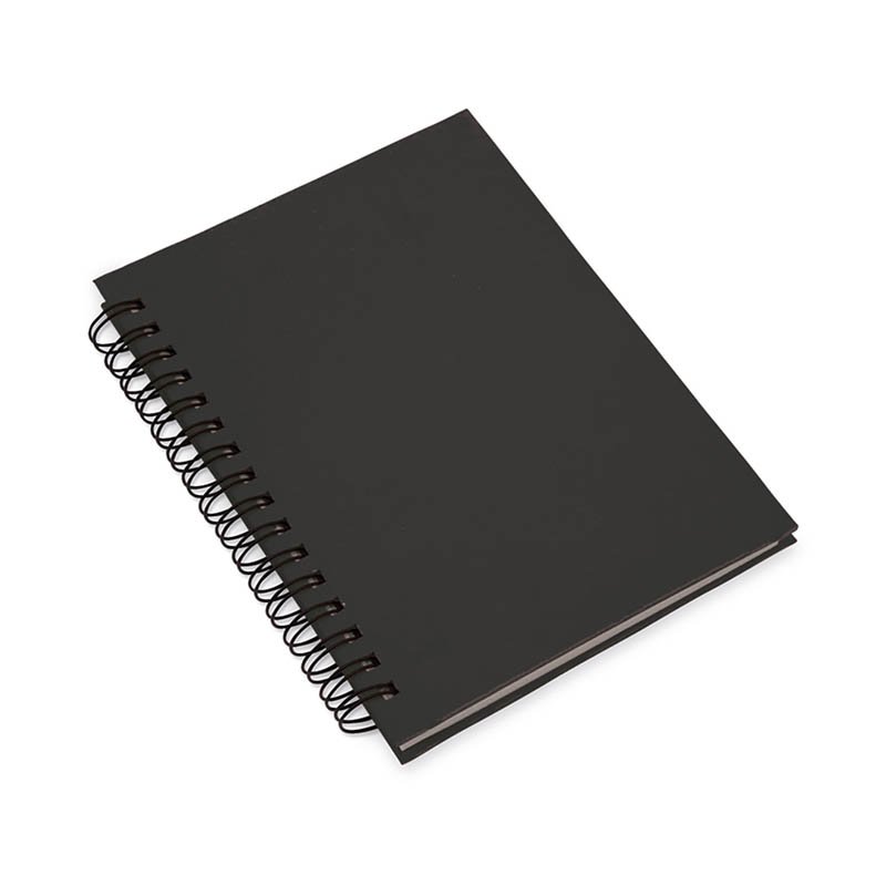 špirálový poznámkový blok z recyklovaného kartónu od mlieka. Parametre: 140 linajkovaných strán, guľôčkové pero s modrou náplňou a gumené remienko.