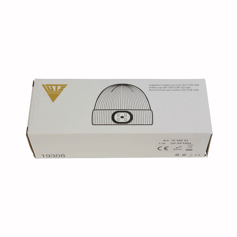 Knitted 100 % acrylic cap with detachable LED light and rechargeable with USB. Conditioned in a gift box