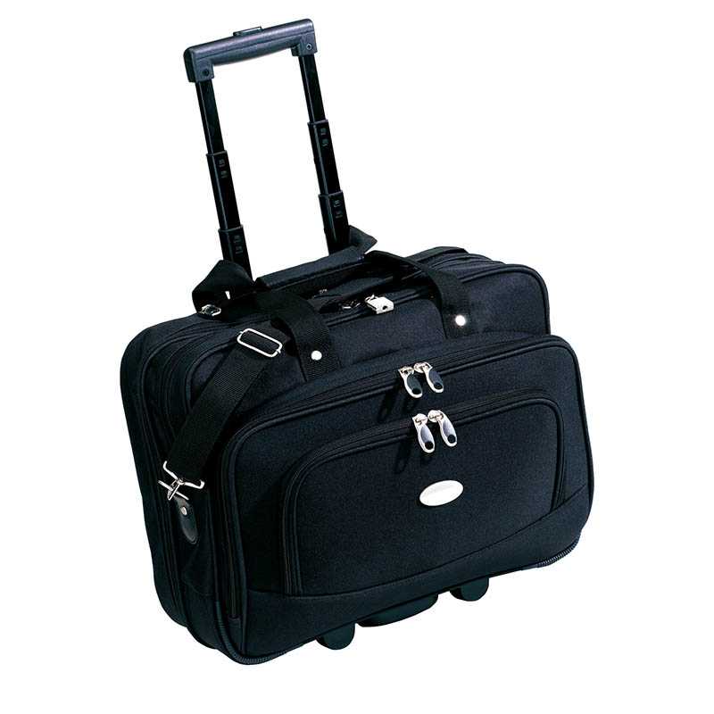 Trolley case made of 1000D polyester with large main compartment, double zip, several pockets, 2 solid wheels and telescopic aluminium handle. Capacity 22 litres. Each piece in a shipping box.