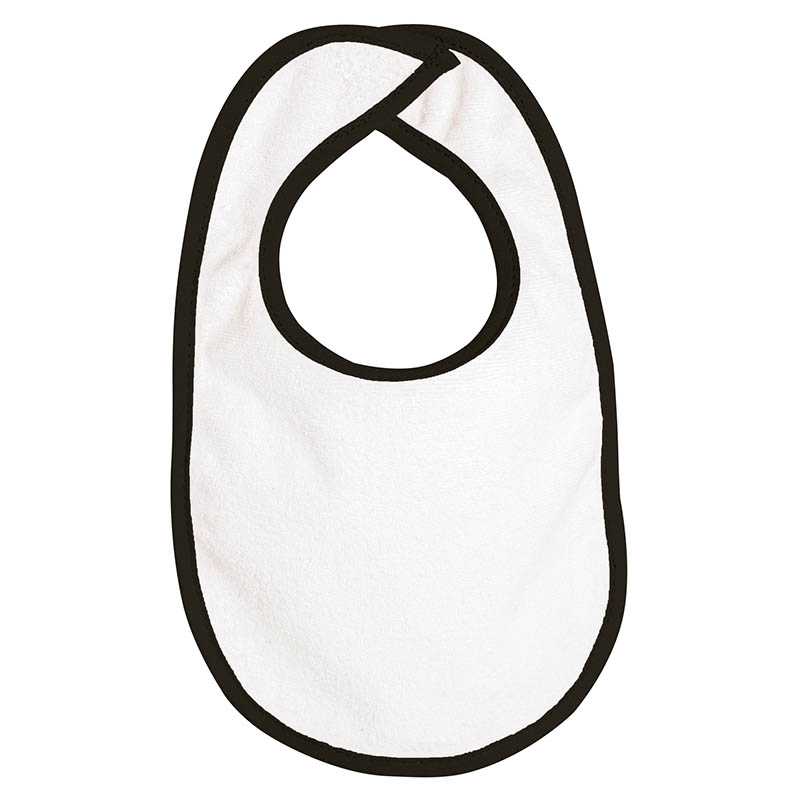 Baby Bib with Elastic Back. Made with a double layer fabric: a smooth poplin layer that allows for easy printing and an absorbent towelling layer that effectively retains and soaks up liquids. Elasticated band for easy fastening at the nape of the neck. Ribbed seams all around for added strength and durability. Suitable marking methods: screen printing, transfer printing, vinyl application. Ideal as a personalised gift, daily use, merchandising, souvenir, and more.
