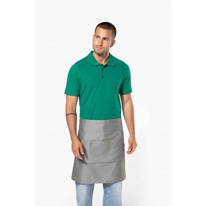 Dlouhá "bistro" zástěraOdolná kombinace bavlny a polyesteruZavazovací šňůra po celé délce zástěryRozměry: šířka 100 cm, délka 75 cmPraní na 60°C, možno sušit v sušičce