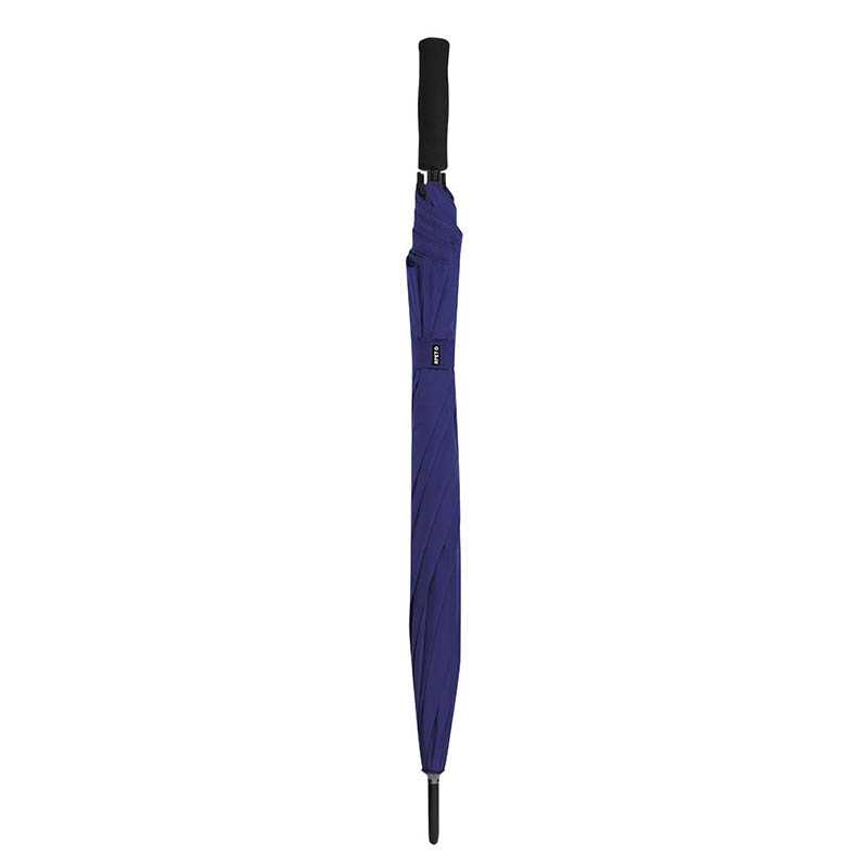 Umbrella with automatic telescopic opening. 190T polyester canopy, fibreglass frame, metal stem, velcro closure and classic curved handle.