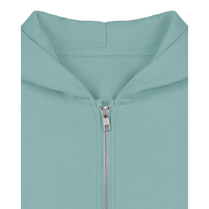 Set-in sleeve Self Fabric lined hood Single jersey tape at inside back neck seam Self fabric half moon at back neck with 3 mm twin needle Single needle topstitch at neckline seam 1x1 rib at sleeve hem and bottom hem 2 needle topstitch centered on sea
