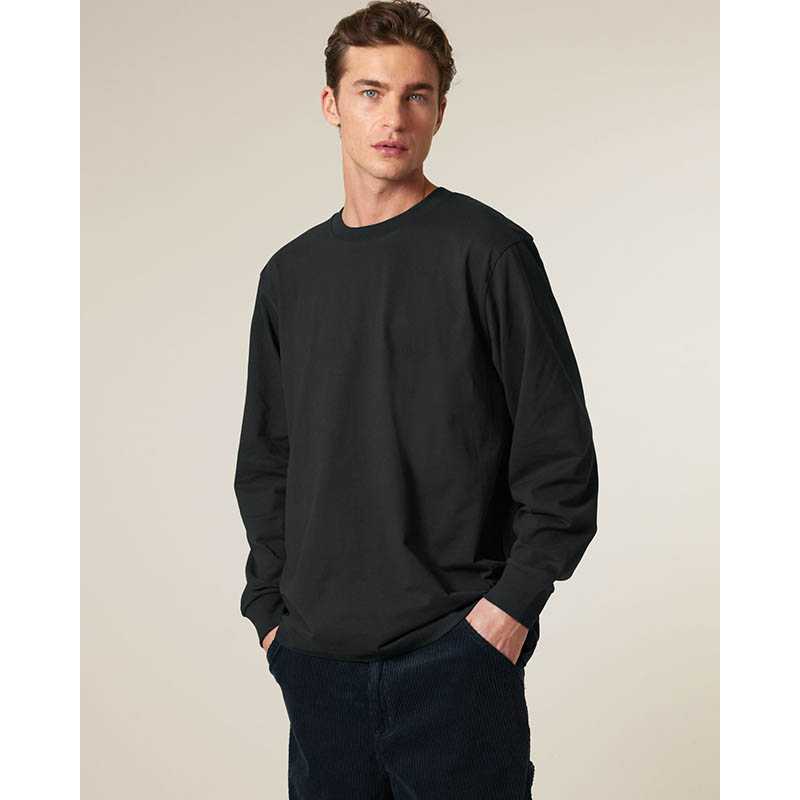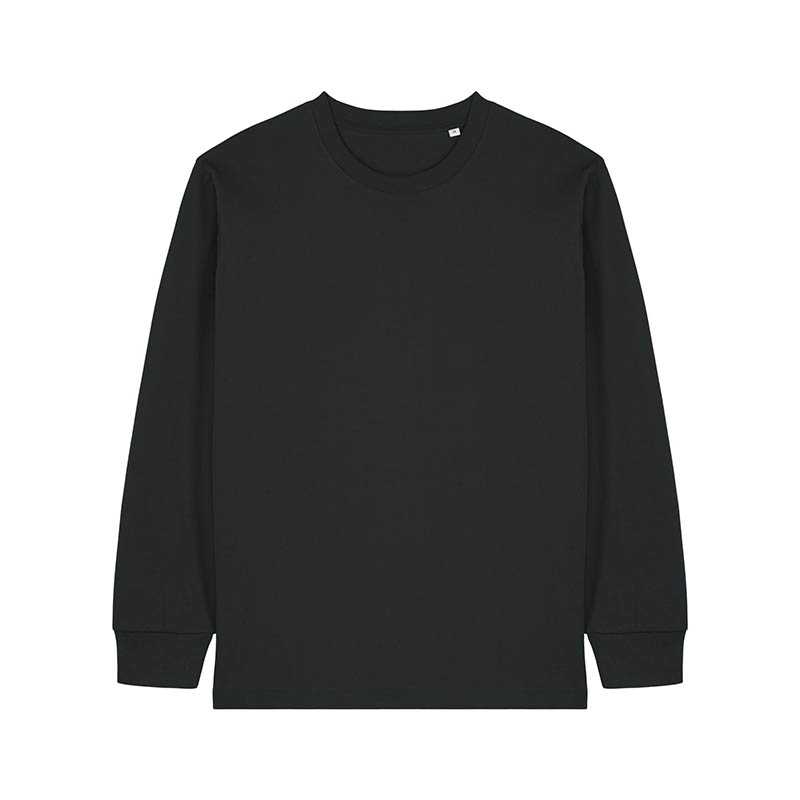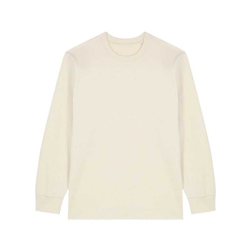 NOVINKA 2025. Set-in sleeve 1x1 rib at neck collar and sleeve cuffs Double needles topstitches at bottom hem Inside back neck tape in self fabric Slightly rougher fabric characteristic