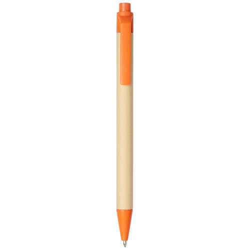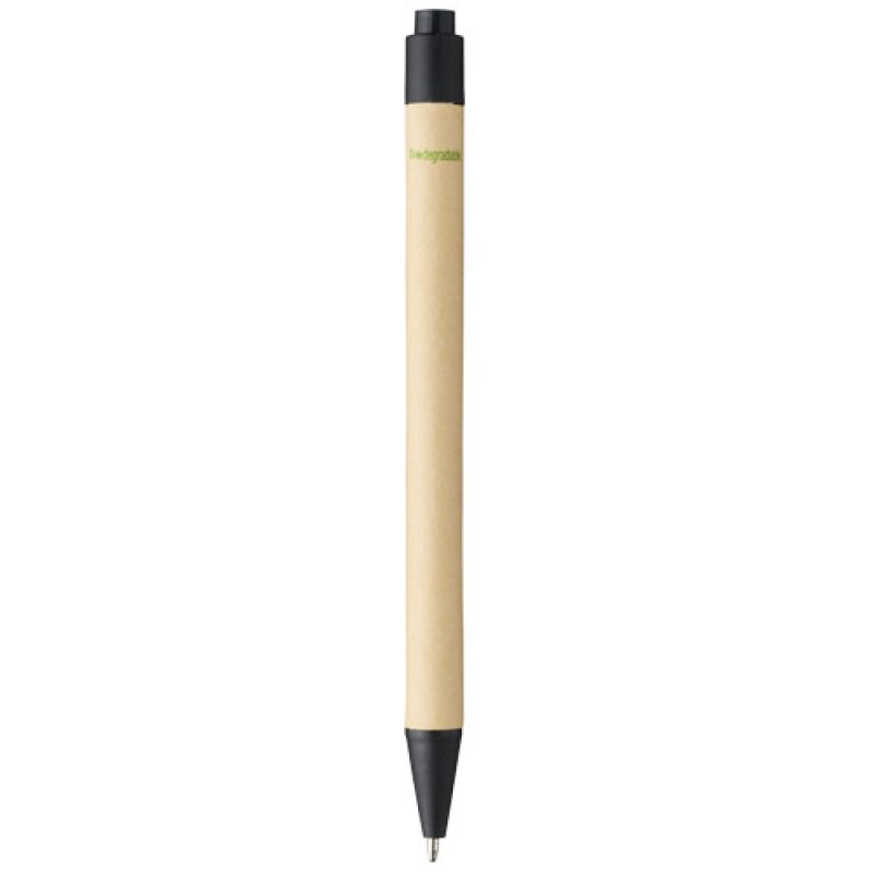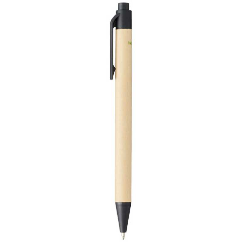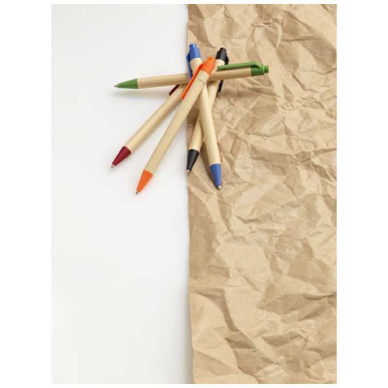 Ekologické kuličkové pero se stiskacím mechanismem, tělem vyrobeným z biologicky odbouratelného papírového materiálu a s doplňky z kukuřičného plastu, dostupné v různých barvách. Barva recyklované lepenky se může různit.