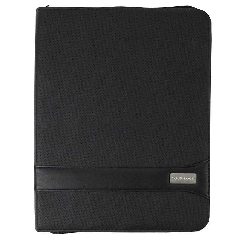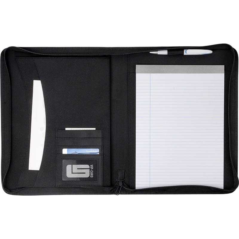 PVC zipped conference folder (approx. A4) with notepad with 30 lined pages, two large internal pockets, four small credit card size pockets, and pen loop (pen not included).