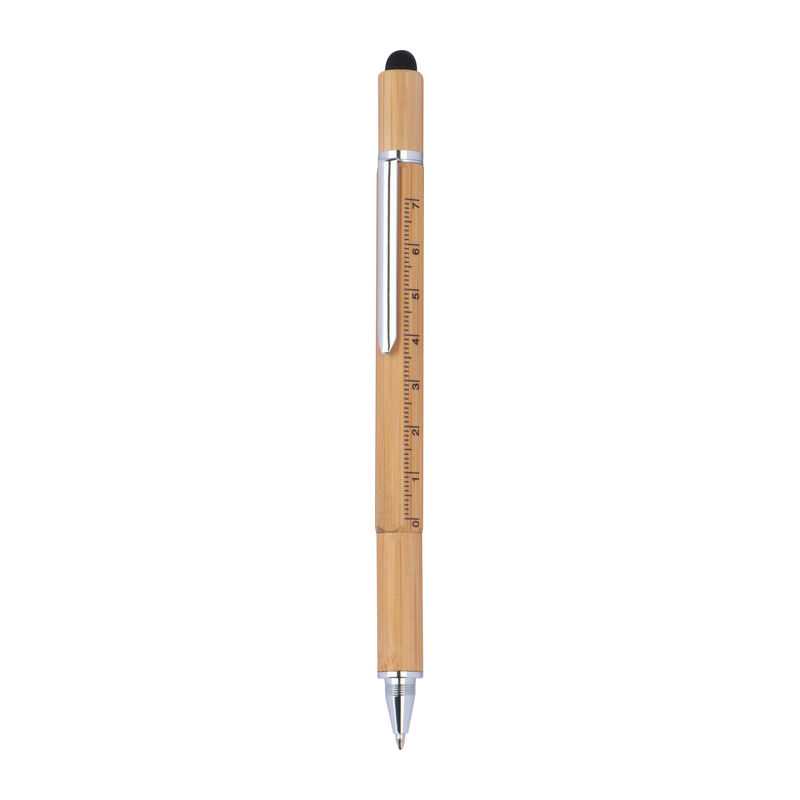 Multifunkční otočné kuličkové a dotykové pero z bambusu. S oboustranným šroubovákem, vodováhou a pravítkem 7 cm. S modrou náplní.