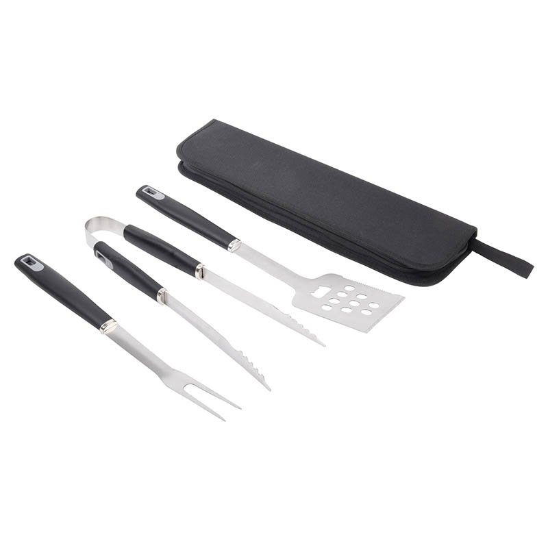 Stainless steel, four-piece barbecue set in a nylon zipper pouch with carrying straps. Including: a long brush, a tong, a meat fork, and a spatula.