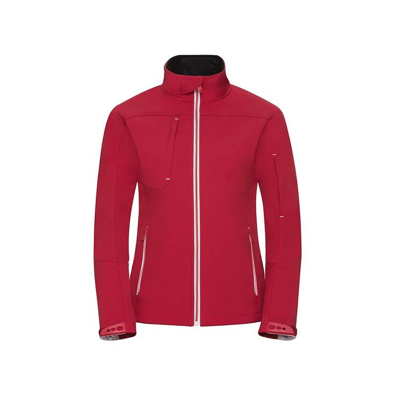 The Bionic Softshell Jacket is the latest member of the Russell Europe softshell family. This excellent fitting softshell jacket with its timeless design is highly water and wind resistant. The Bionic-Finish® Eco enables the jacket to be water repellent in an ecological way. Perfect for evoking a smart corporate image for those who are searching for a piece of modern outerwear to top off their corporate look. 1. High performance DWR fabric with hydrophobic membrane 2. Treated with Bionic-Finish® Eco 3. Fluorine and PFC free 4. Contemporary shaped fit 5. Contrasting zips and accents for a refined look 6. High moisture vapour transfer with hydroshell air panels at armpits for enhanced movement and breathability 7. Covered zipped pockets: one at chest and one at sleeve 8. Protecting chin guard 9. Stand up collar and inner storm flap to ward off wind and draught 10. Adjustable sleeve hems with injected cuff tabs 11. Inside front honeycomb jersey lining and generous mesh media pocket 12. Seamless shoulder parts for higher comfort and maximum space for decoration
