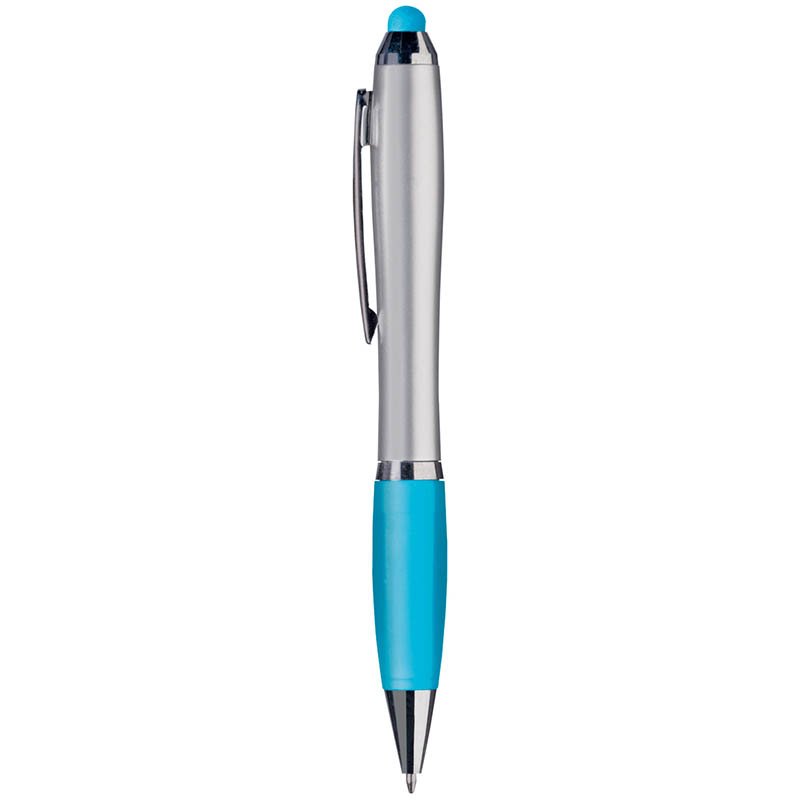 Blue ink ballpoint pen with coloured rubber top/pointer to operate touch screens (eg iPhone/iPad), metallic look barrel, non-slip grip, recess in metal clip and twist mechanism.