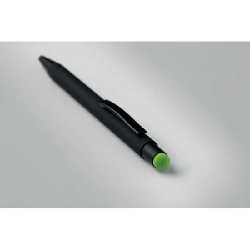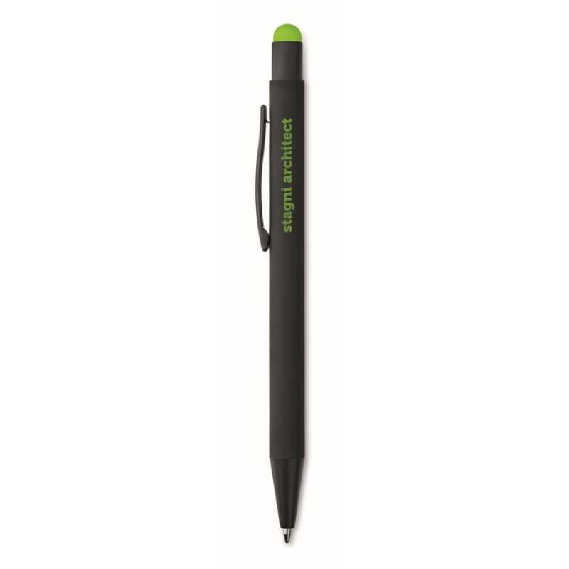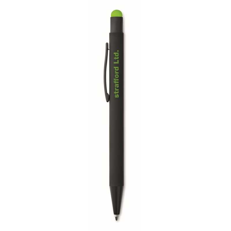 Blue ink, aluminium ballpoint pen with rubber top/pointer to operate touch screens (e.g. iPhone/iPad), matte coloured, metallic look barrel and metal clip. Give your gift more character with one of our stylish gift packaging. This pen is also known as the