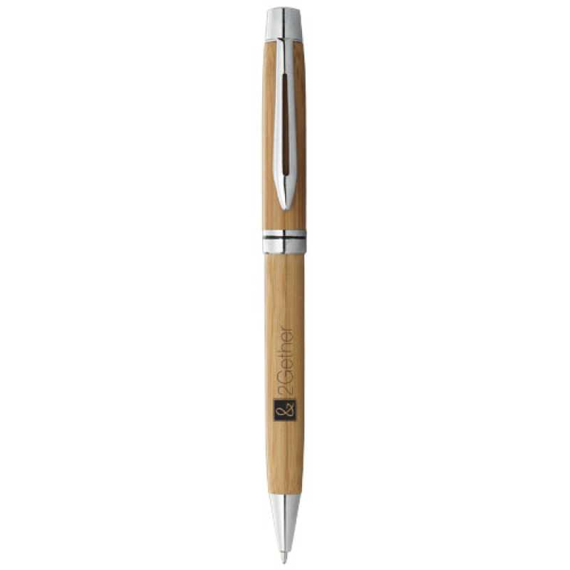 Guľôčkové pero z bambusu a hliníková plastu s kovovou povrchovou úpravou. Obsahuje otočný mechanizmus a kovovú sponu. Čierny atrament. Keďže výrobok je vyrobený z prírodných materiálov, farba a výsledok tlače sa môžu medzi výrobkami líšiť. Guľôčkové pero: O12 x 136mm | Krabička: 23 x 155 mm