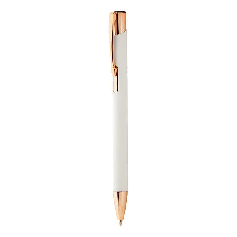 Guľôčkové pero z recyklovaného hliníka s pogumovaným povrchom a detaily z ružového zlata. So špeciálnou povrchovou úpravou na zrkadlové laserové gravírovanie vo farbe ružového zlata. S modrou náplňou.