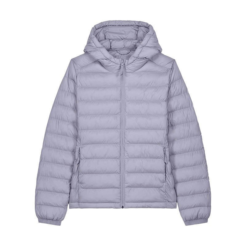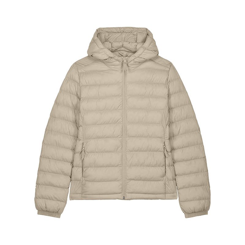 NOVINKA 2025. Set-in sleeve High collar with grown on hood Hood opening and bottom hem with adjustable plastic stopper and elastic cord Reverse nylon zip at center front Zipped welt pockets with extra grosgrain puller Fully quilted Side panels fo