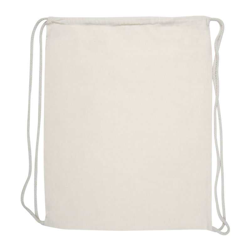 NOVINKA 2025. Drawstring backpack in Recycled cotton material 120 g/m2. Self closing strings in cotton, with eco label on one side and available in a wide range of nature colours. Resistance up to 4kg in weight.