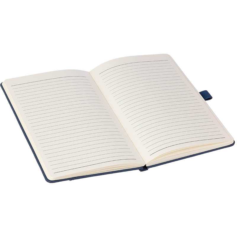 Poznámkový blok formátu A5 z recyklovanej kože s gumičkou na zatváranie, záložkou a 160 linajkovými stranami.