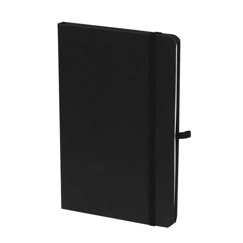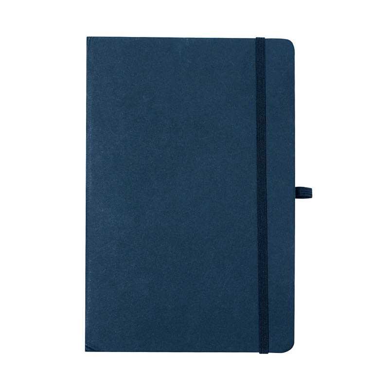 Poznámkový blok A5 s tvrdými PU deskami a 192 stranami (96 listů) recyklovaného papíru. Barevně stejný elastický pásek a záložka.