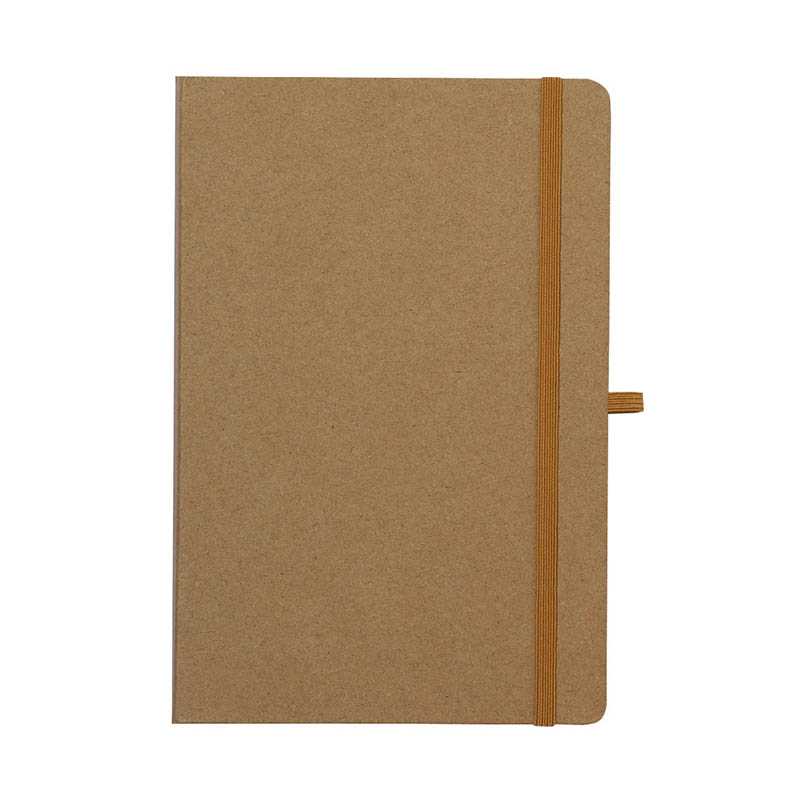 Zápisník A5 s tvrdými deskami z recyklovaného kartonu, 160 linkovaných stránek (80 listů) recyklovaného papíru, barevná záložka a gumička.