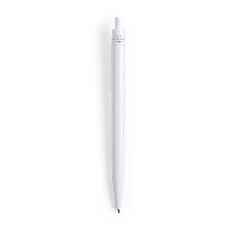 NOVINKA 2025. Antibacterial ball pen with push-up mechanism. Monochromatic design in a wide range of bright tones with a glossy finish, especially designed for pad printing. Blue ink refill. Products with antibacterial treatments are able to drastically reduce the bacterial levels present on the surfaces of the materials, thanks to the addition of permanent static microbial agents, with high effectiveness in inhibiting and preventing bacterial contamination. Item according to the ISO 22196 standard, which determines the antibacterial activity in plastic materials and non-porous surfaces. This allows us to know the effectiveness of microbial inhibition that additives have on treated objects by means of a quantitave evaluation.
