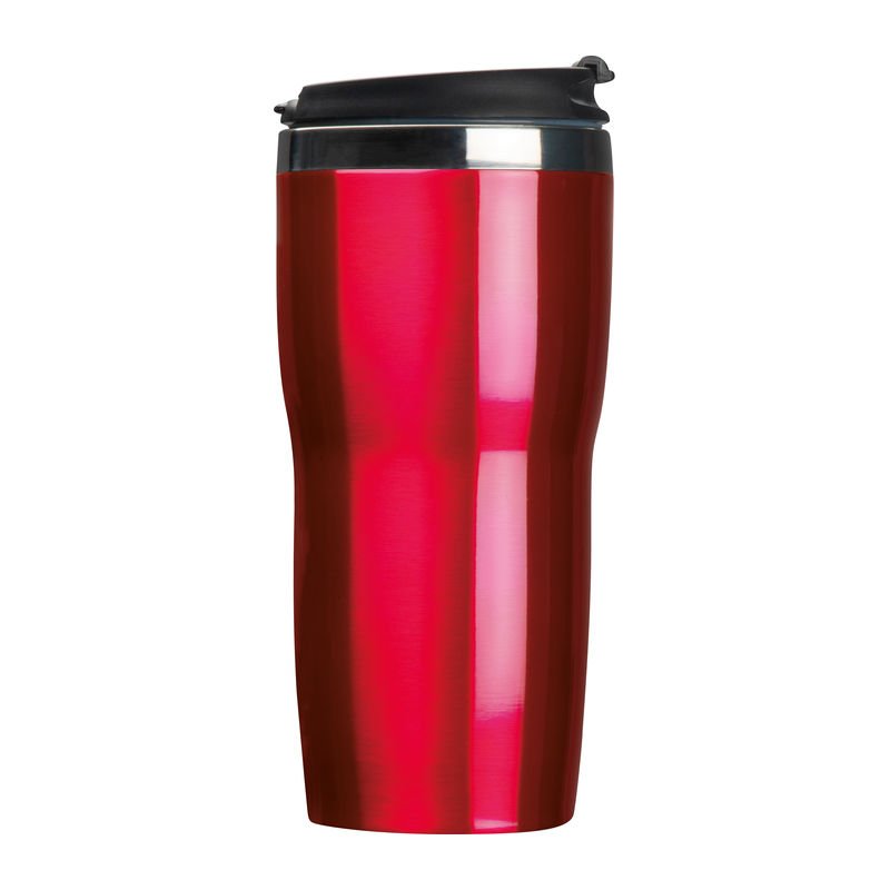 Double-walled travel mug ARABICA: made of stainless steel on the inside and outside, coloured plastic lid with a secure screw cap, OPEN/CLOSE push button, and integrated drinking opening, coloured rubber sleeve for a better grip, and rubberised stand for