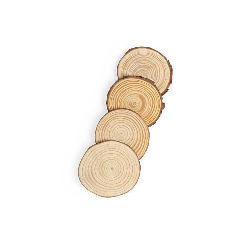 NOVINKA 2025. Coaster set in natural pine wood. Including 4 pieces around 1 cm thickness. Natural cut, with coaster diameters around 8-10 cm, including rope in natural jute material.