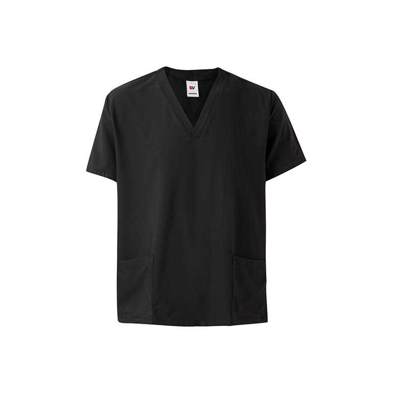 V-neck Side openings Liquid repellent and antibacterial fabric Three pockets: 2 lower patch pockets, one of them with an inner pocket