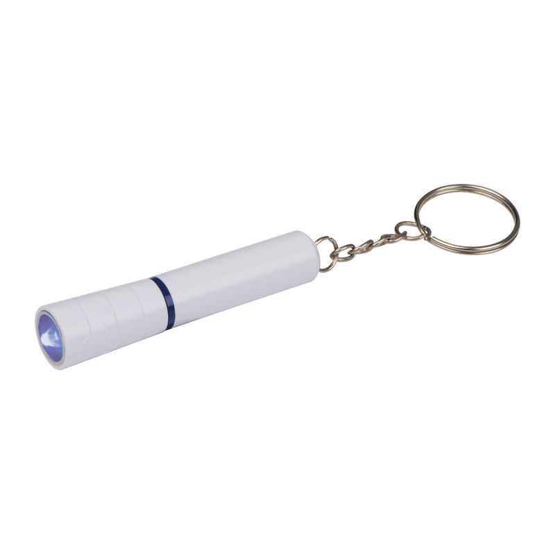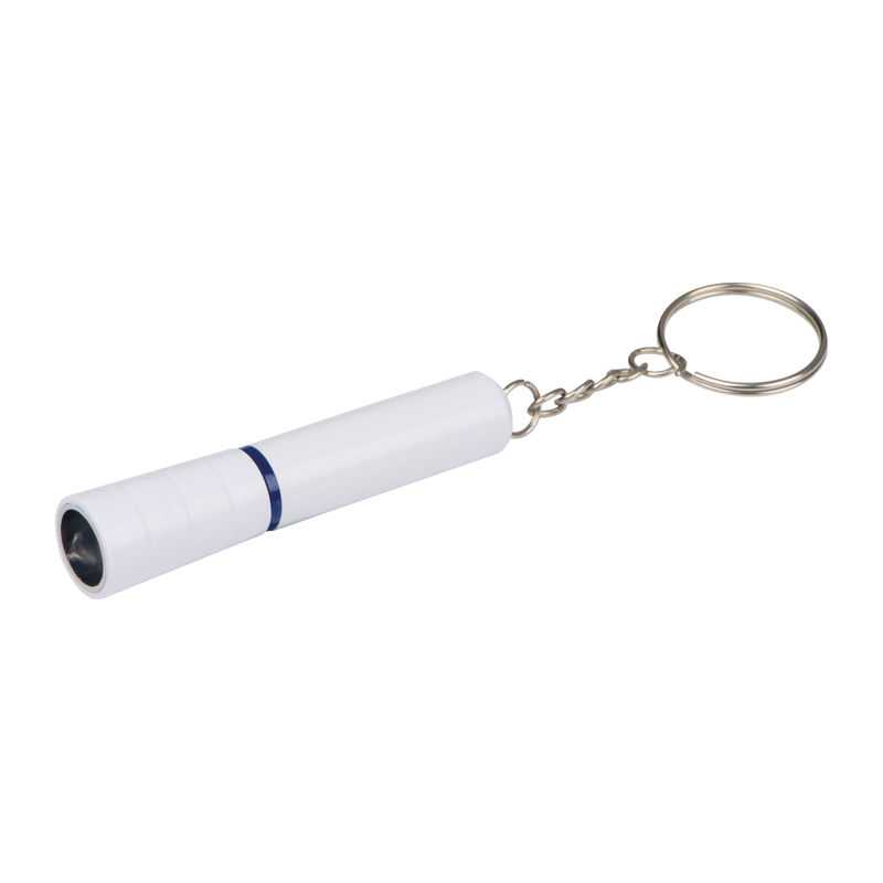 Plastová mini baterka s bielym LED svetlom a príveskom na kľúče. Dodávané s gombíkovou batériou.
