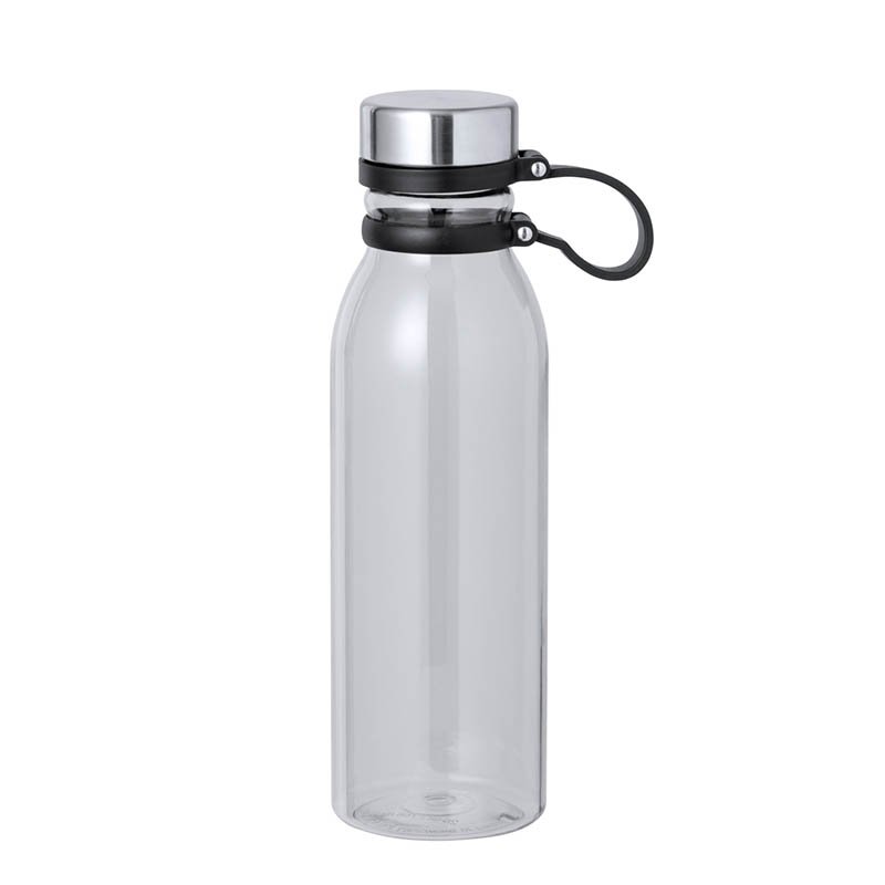 NOVINKA 2025. RPET bottle with a capacity of 830 ml. Stainless steel safety screw cap and original silicone strap for easy transport. Available in a selection of translucent colours. BPA free and presented in an attractive kraft design box. The RPET material is made from recycled plastic to encourage the reuse of plastic waste and help the sustainability of the planet.