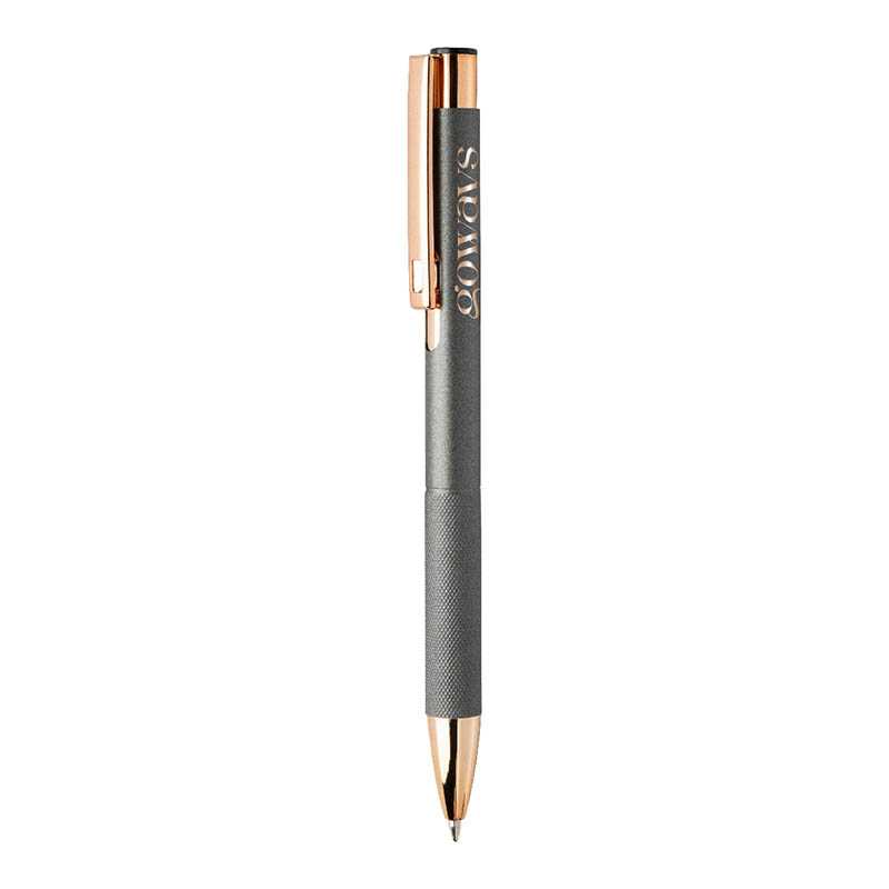 NOVINKA 2025 XMASS. Guľôčkové pero z recyklovaného hliníka s matným telom, textúrovaným úchopom a detailmi ružového zlata. So špeciálnym povrchom na zrkadlové laserové gravírovanie vo farbe ružového zlata. S modrou náplňou.