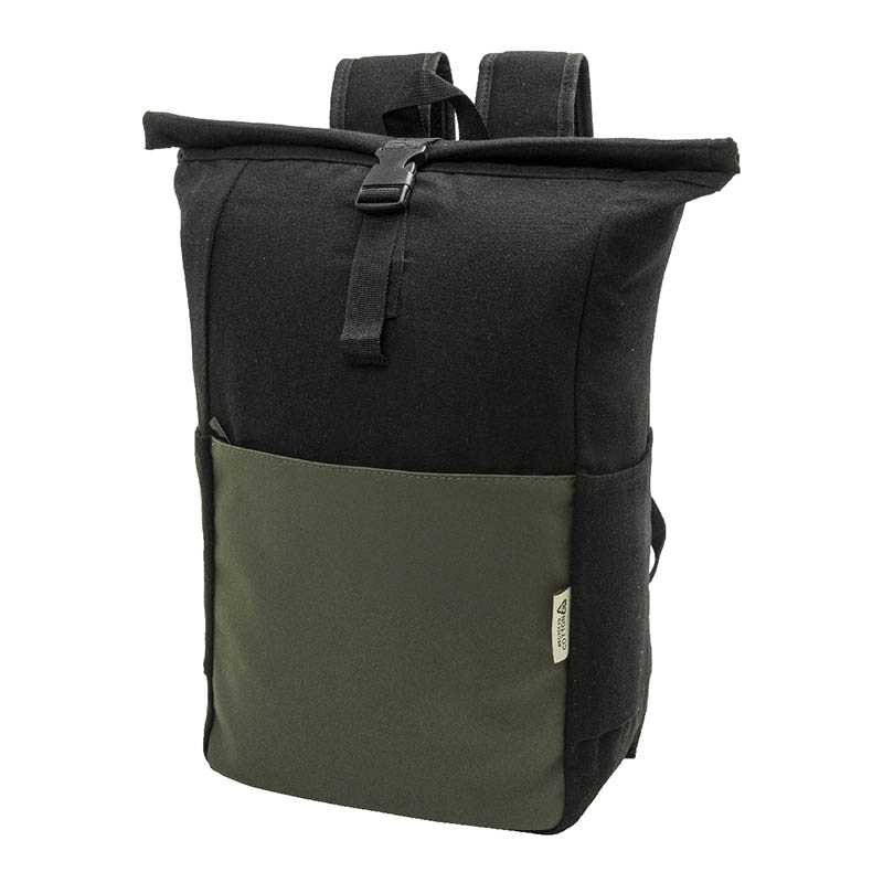 NOVINKA 2025 XMASS. Rolovací batoh z recyklovaného plátna, zapínaním na pracku a predným vreckom na zips z mäkkej recyklovanej PU kože. S polstrovanou priehradkou na notebook (15"), bočnými vreckami, polstrovaným chrbtom a ramennými popruhmi. 70% recyklov