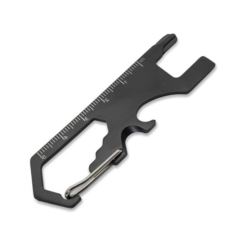 Viacúčelové náradie z kovu s karabínou. Súčasťou je plochý skrutkovač, pravítko, kľúč, rezač, otvárač na fľaše, krížový skrutkovač, pilník.
