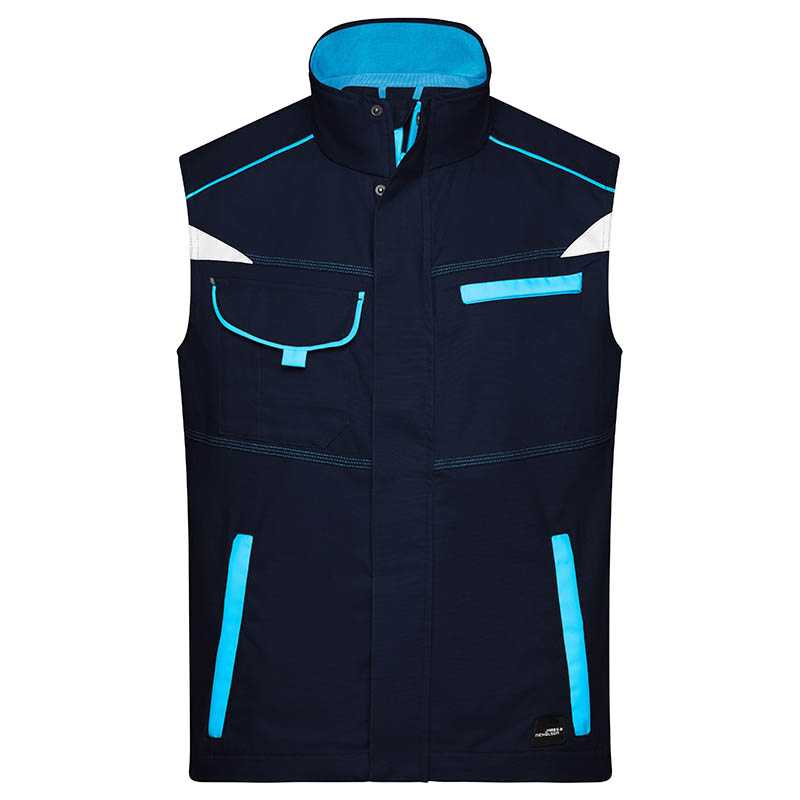 Pánská pracovní vesta James & Nicholson Workwear Vest.Profesionální vesta s vysokou kvalitou vybavení..Vnější látka: 65% polyester, 35% bavlna.Vnější materiál 2: 100% polyamid.Robustní a odolná směsová tkanina.Stojací límec s měkkým rounem uvnitř.Ramenní