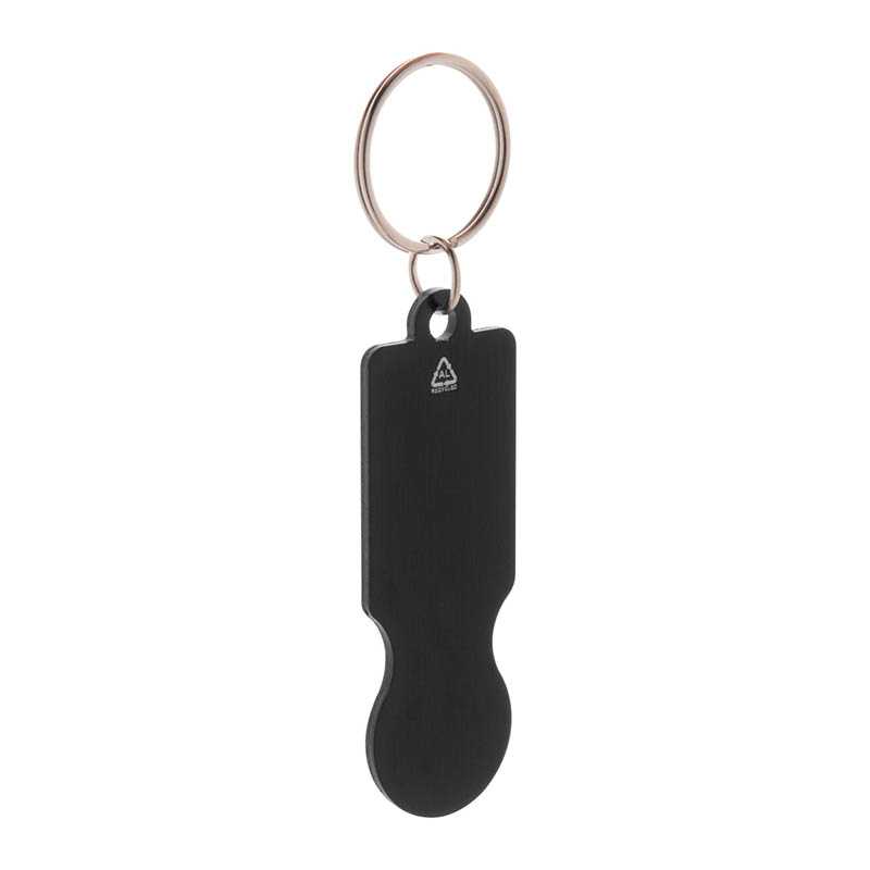 Prívesok na kľúče z recyklovaného hliníka s mincou do nákupného vozíka.