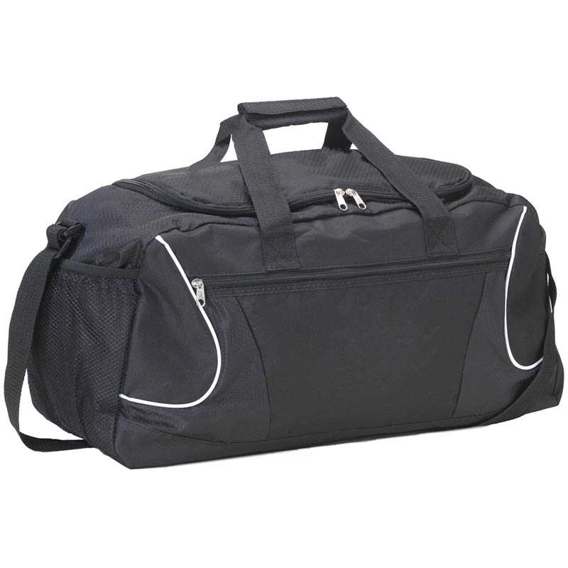 Polyester (600D) sports bag with large front pocket, reflective stripes, and an adjustable shoulder strap.