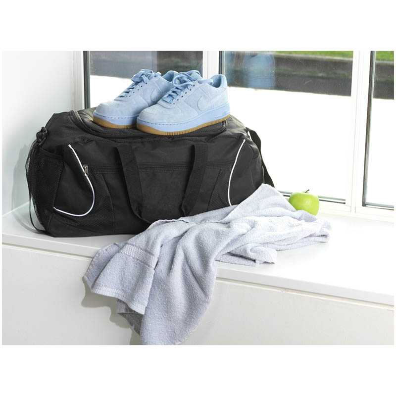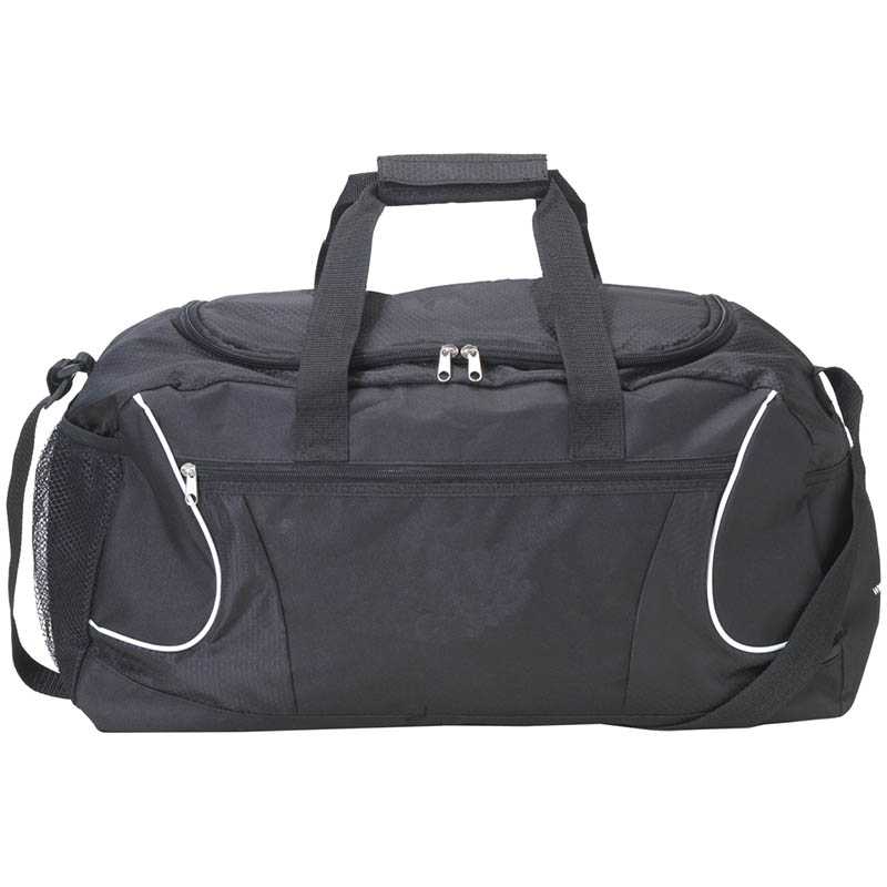 Large sports/travelling bag made of 600D polyester. With front pocket with zipper, mesh pocket, 2 handles and an adjustable shoulder strap. Capacity 22 litres.