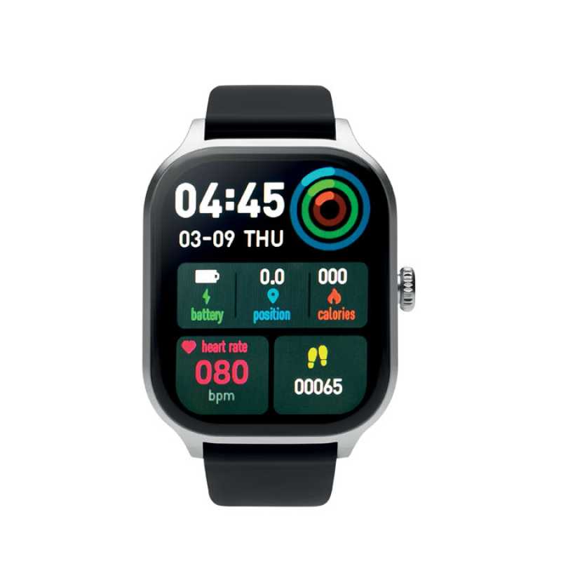 PC and PVC smart watch with adjustable wristband and wireless technology. With touchscreen and scrolling button on the side. Functions: phone call, heartrate, sleep monitor, oxygen measure, message reminder, drinking water reminder, exercise reminder. Inc