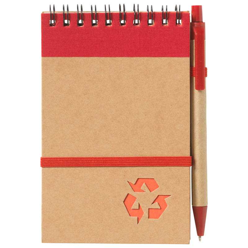 Recycled cardboard, wire bound notebook with 60 lined pages and ballpen with biodegradable parts and blue ink. 100% Recycled paper.