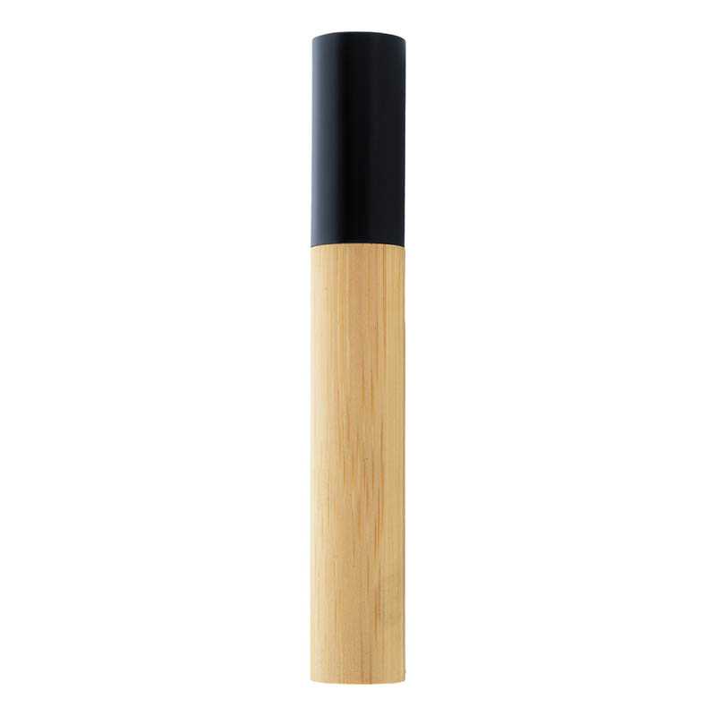 Elegantné čierne kovové guľôčkové pero s bambusovým telom a čiernymi časťami. V púzdre z bambusovej tuby s čiernym uzáverom. S modrou náplňou.