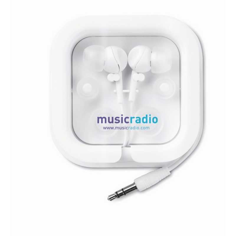 NOVINKA 2025. Handy and comfortable earphones with Type-C connection. In white finish with chrome details, including 3 pairs of pads to fit all ears. Presented in a compact, matching case with cable winder and transparent cover.
