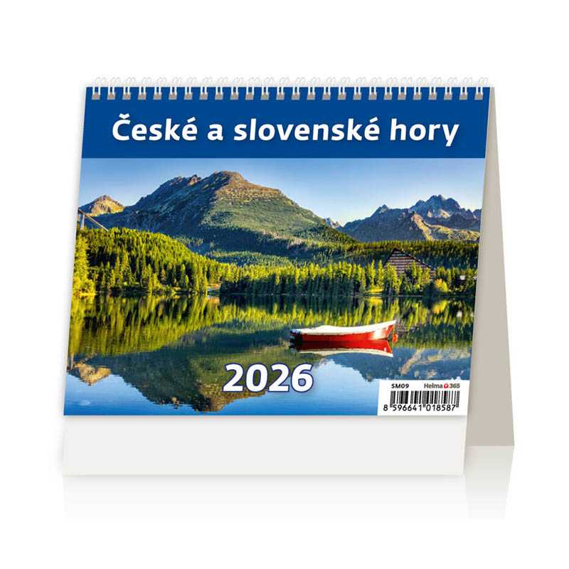 Stolový kalendár České a slovenské hory 2026. Formát kalendára: 17,1 x 13,9 cm. Kalendárium: české/slovenské týždenné riadkové. Počet strán: 56 + 2. Stojanček kalendára: so zámkom. Priestor na potlač: 17,1 x 2,5 cm