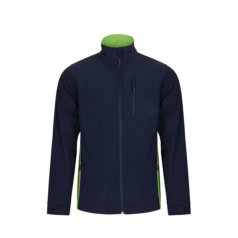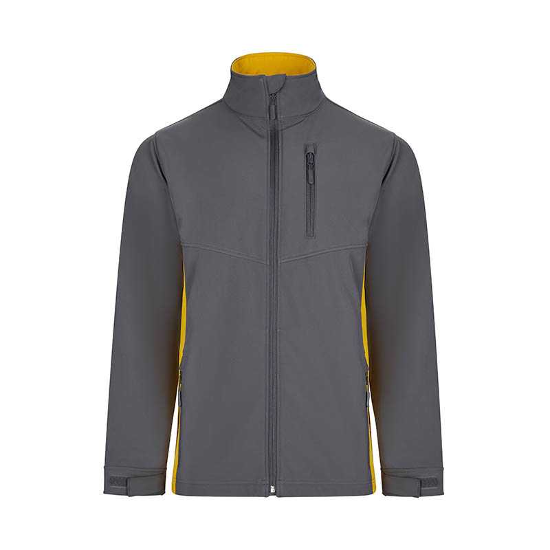 Front closure with contrasting inverted zip Soft-shell fabric piece in the chest to ease marking Inner upturned cover flap with zip cover Contrast colour in zips and soft-shell fabric re
