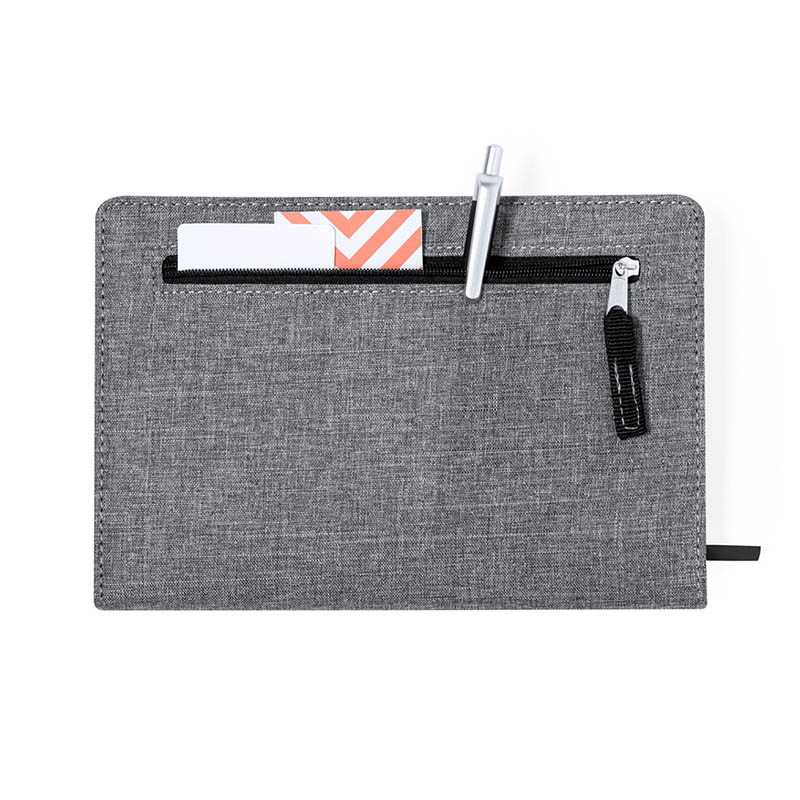 Zápisník potiahnutý polyesterom 600D RPET so 100 linajkovými listami, záložkou a gumičkou. Veľkosť A5.